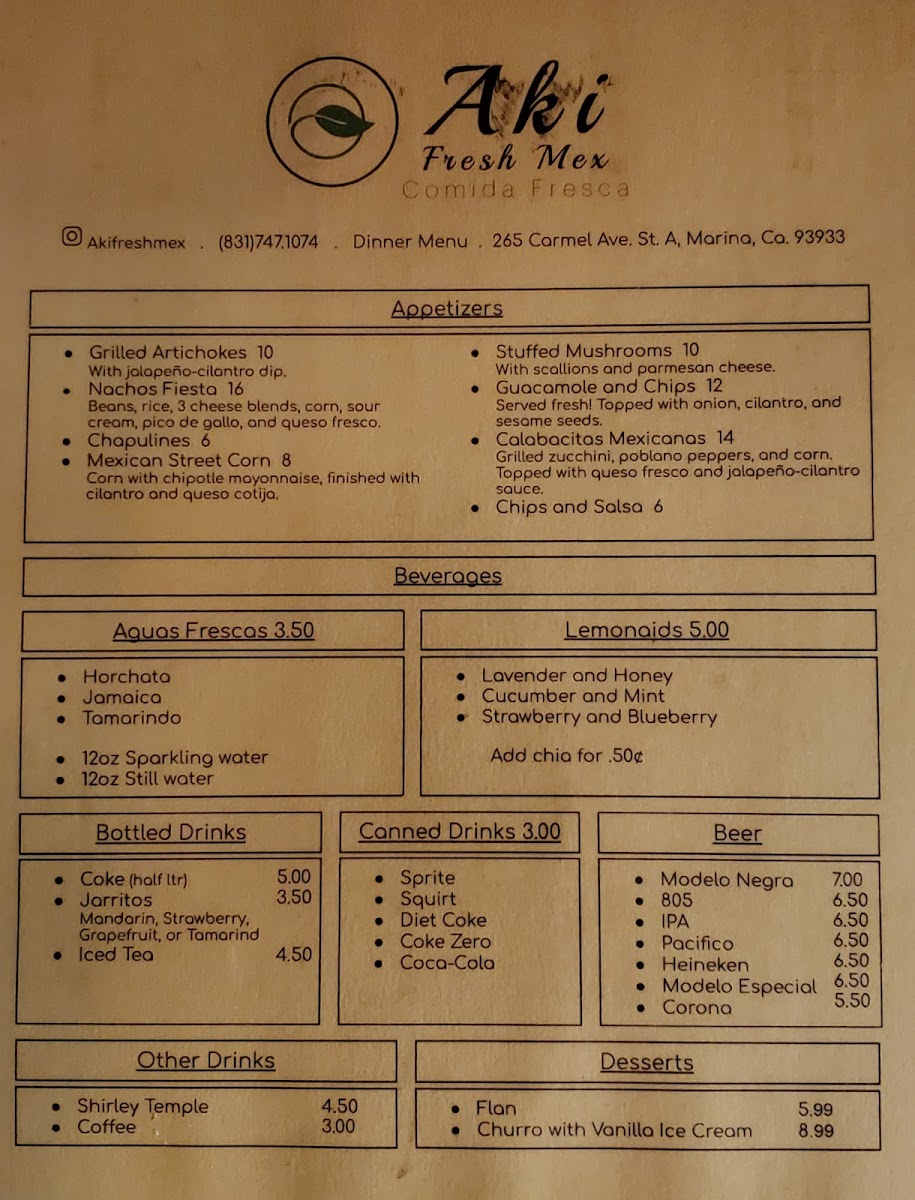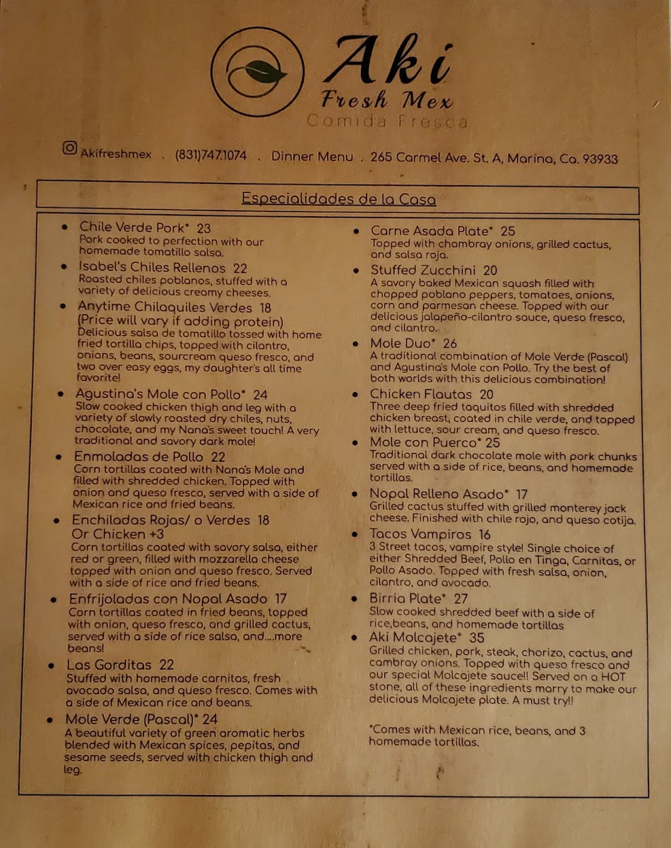 The menu at Aki Fresh Mex offers a comforting blend of traditional and inspired Mexican dishes, perfect for casual dining any time of day. Whether you’re stopping in for a relaxed lunch or settling in for a cozy dinner, you’ll find a selection of flavorful plates that bring fresh ingredients and familiar flavors together with thoughtful touches.
